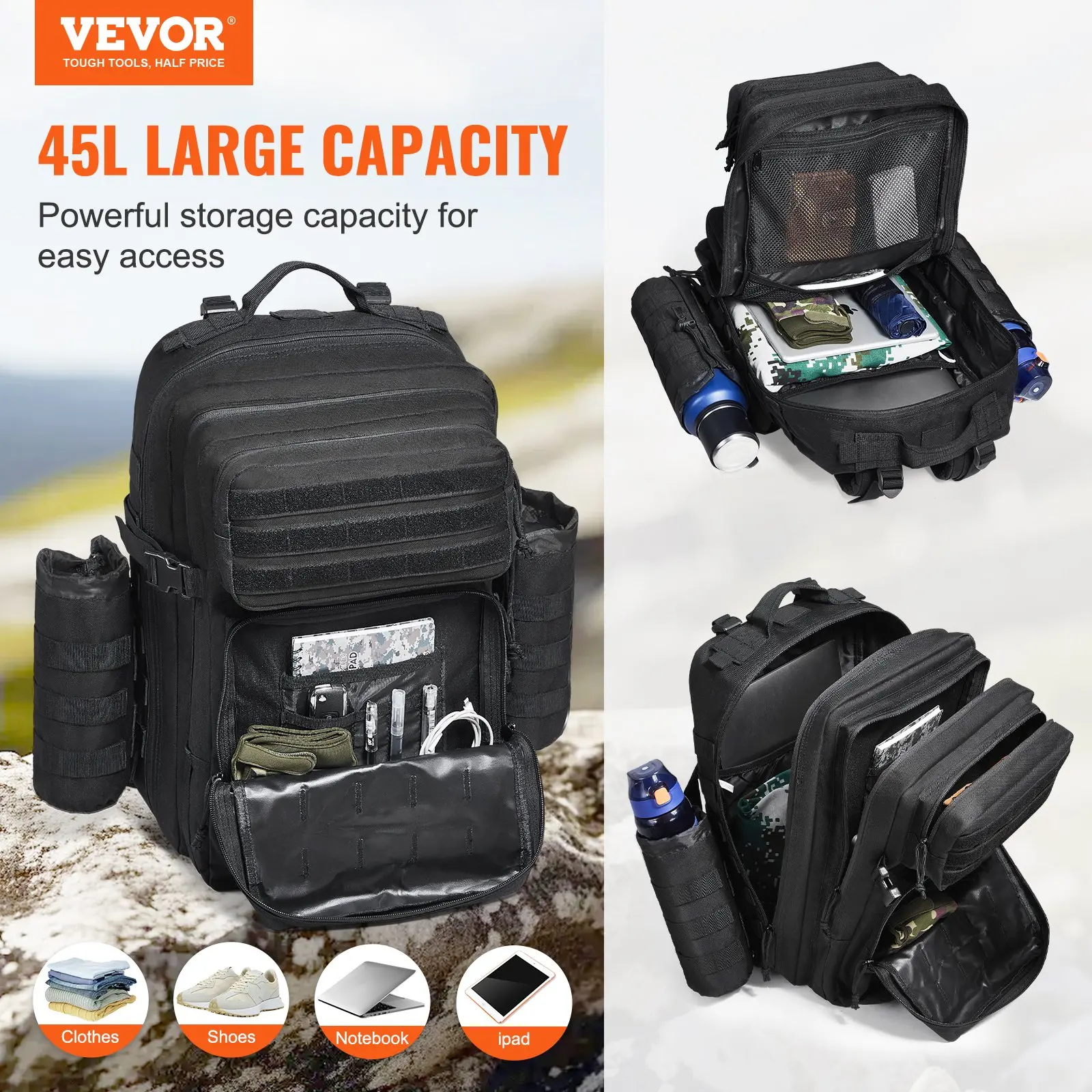 Product Type: Regular Tactical Backpack – Modular,Capacity: 45L,MOLLE System: Yes,Color: Black,Model: BK-2593,Carrying Options: Handheld/Backpack Straps,Product Weight: 3.09 lbs / 1.4 kg,Product Dimensions: 12.60 x 11.42 x 18.11 in / 320 x 290 x 460 mm,Main Material: 600D Polyester